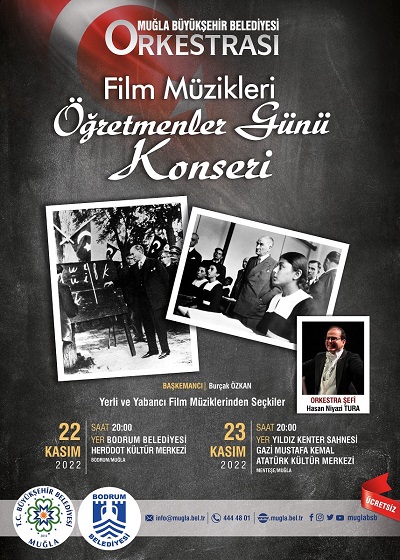 24 Kasım Öğretmenler Günü’nde Muğla Büyükşehir Belediyesi farklı etkinlikler düzenleyecek. 22 Kasım’da Bodrum Belediyesi işbirliği ile Muğla Büyükşehir Belediyesi Orkestrası tarafından “Film Müzikleri Öğretmenler Günü Konseri” Herodot Kültür Merkezi’nde, aynı etkinlik 23 Kasım’da Gazi Mustafa Kemal Atatürk Kültür Merkezi Yıldız Kenter sahnesinde sanatseverlerle buluşacak. Film Müzikleri Orkestrası Öğretmenler Günü konserinde orkestra şefi Hasan Niyazi Tura, baş kemancı Burçak Özkan olacak. 25 Kasım’da da Muğla Büyükşehir Belediyesi Türkan Saylan Çağdaş Yaşam Merkezi’nde 24 Kasım Öğretmenler Günü etkinliği düzenlenecek. Zaya kitapevi işbirliği ile düzenlenecek etkinlikte Muğla Büyükşehir Belediyesi Konservatuvarı Halk oyunları gösterisi, modern dans gösterisi ve canlı müzik konseri sanatseverlerle buluşacak.