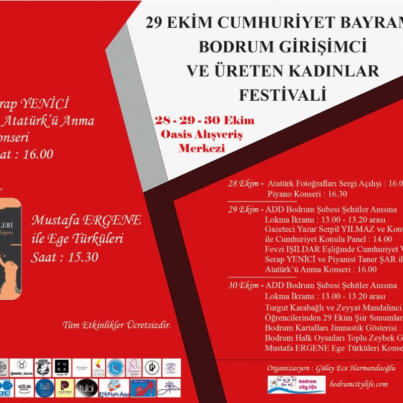 Atatürkçü Düşünce Derneği Bodrum Şube Cumhuriyet coşkusunu ve sevincini yaşamak için tüm Bodrumluları Festivale davet ediyor. Girişimci & Üreten Kadınlar Festivali 28- 29 -30 Ekim tarihleri arasında Bodrum Oasis Alışveriş Merkezi’nde gerçekleşecek.