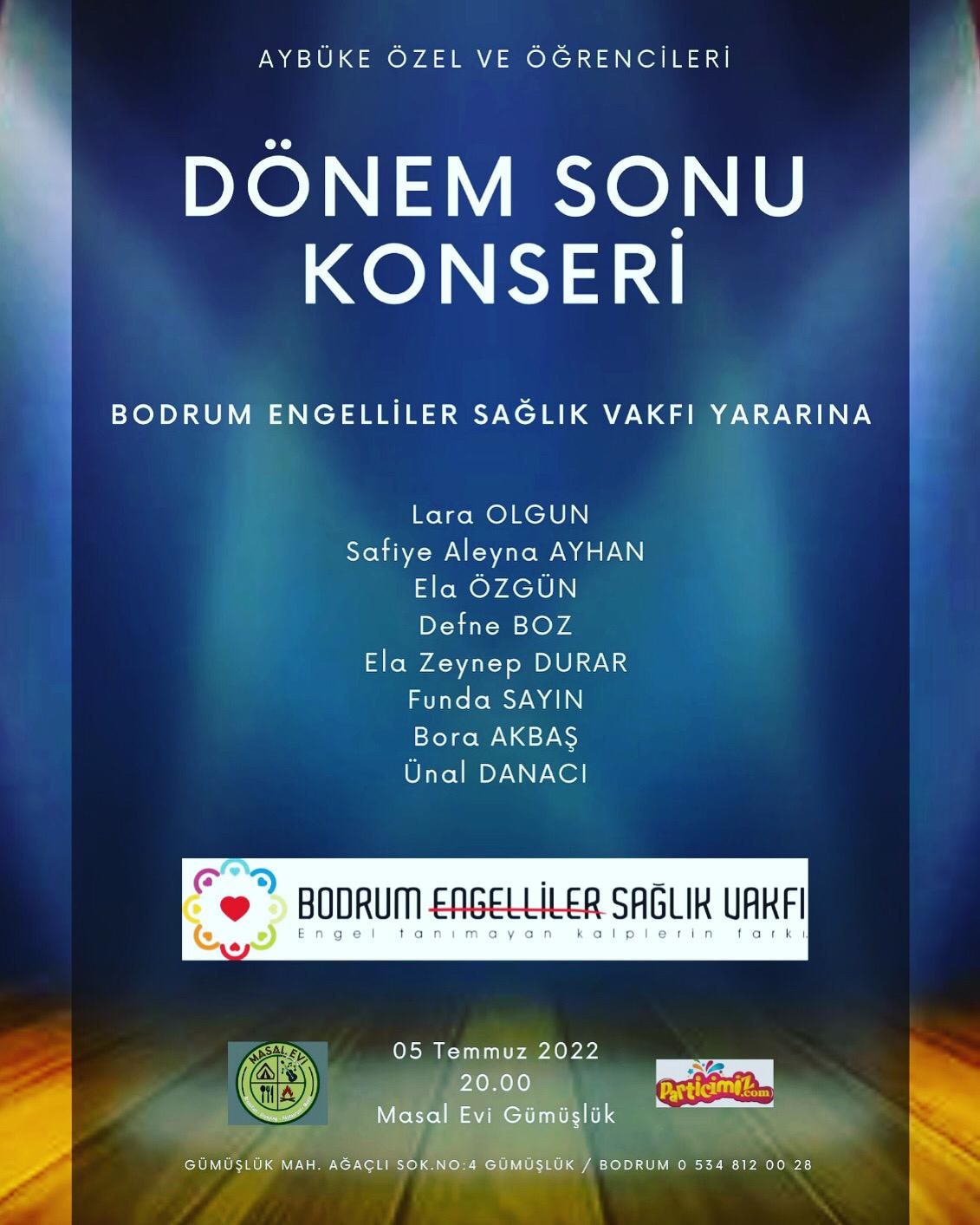2020-2021 yılları arasında Bodrum Engelliler Vakfı öğrencilerine gönüllü şan dersleri veren vakıf gönüllüsü Aybüke Özel, Piyano, şan ve tiyatro öğrencilerinin Bodrum Engelliler Sağlık Vakfı yararına düzenleyeceği “Dönem Sonu Konseri”nin tüm geliri Bodrum Engelliler Sağlık Vakfı’na bağışlıyor.