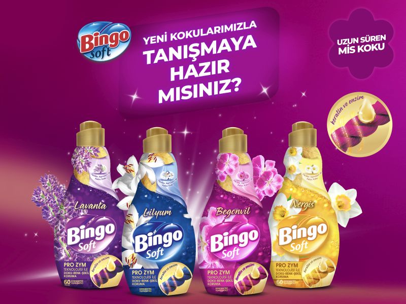Bingo’nun konsantre yumuşatıcı ailesi yepyeni kokularıyla ürün gamını genişletmeye devam ediyor. Bingo Konsantre Soft yenilenen formülü ile doğanın en güzel kokularından lilyum, lavanta, begonvil ve nergis ile çamaşırlarda bahar havası estiriyor. PRO ZYM teknolojisi ile çamaşırların dokusunu, rengini ve şeklini koruyan Bingo Konsantre Soft, parfüm kapsülleriyle uzun süre kalıcı koku sağlıyor.