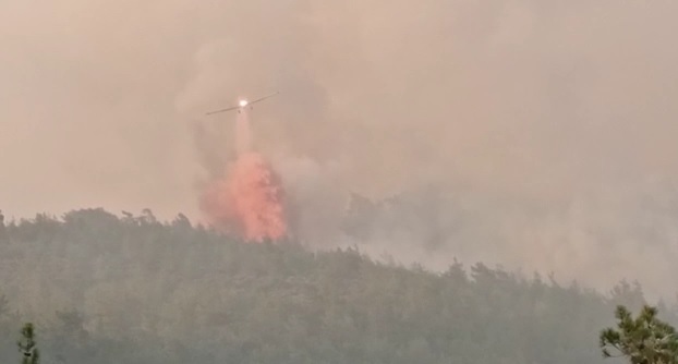 Yanan saha yoğun duman altında bulunurken, uçak ve helikopterlerin yoğun sorti yapması sonrası alevler şiddetini azalttı. Bördübet mahallesinde başlayan ve bir ucu Hisarönü körfezi, diğer ucu Değirmenyanı mahallesine kadar ulaşan yoğun duman nedeniyle görüntü mesafesi azaldı.