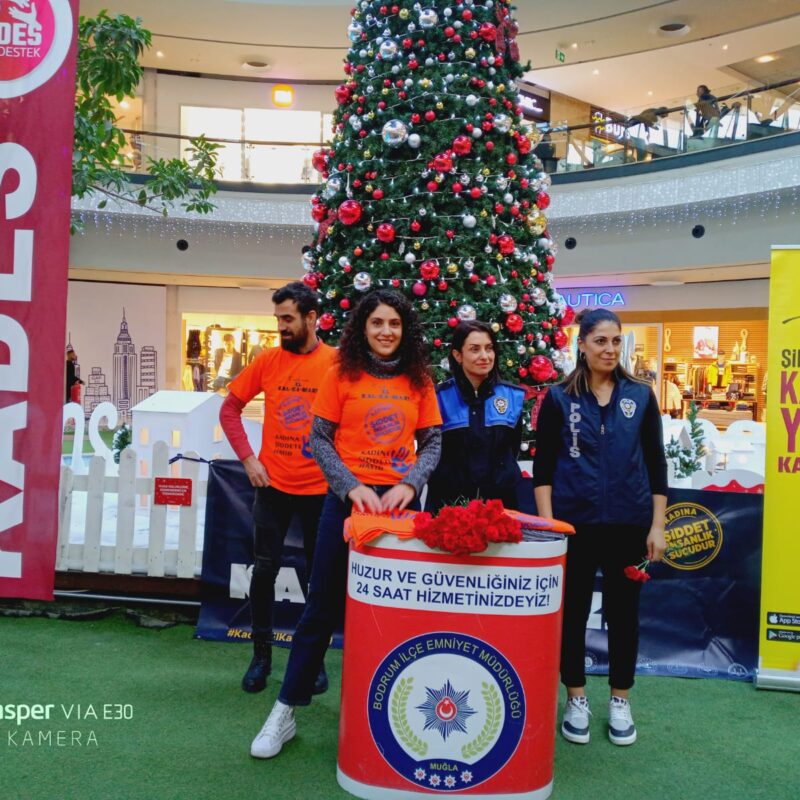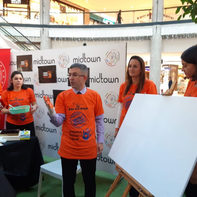 25 Kasım Kadına yönelik şiddete birlikte dur diyelim günü kapsamında” Midtown Alışveriş merkezinde” gerçekleştirilen etkinliğe Bodrum Kaymakamı Bilgehan Bayar, Bodrum Kaymakamlığı İlçe Yazı İşleri Müdür Vekili Nalan Özdamar, Belediye Başkan Yardımcısı Ummahan Yurt, daire amirleri, kamu kurumlarının personelleri katıldı. Etkinlikte günün anlam ve önemine uygun olarak hazırlanan ve üzerinde “Kadına el kal-ka-maz” yazılı turuncu renkli tişört giyen Kaymakam Bayar ile diğer katılımcılar, ‘kadına şiddete hayır’ diyerek tuvale boya ile el izini yaptı.