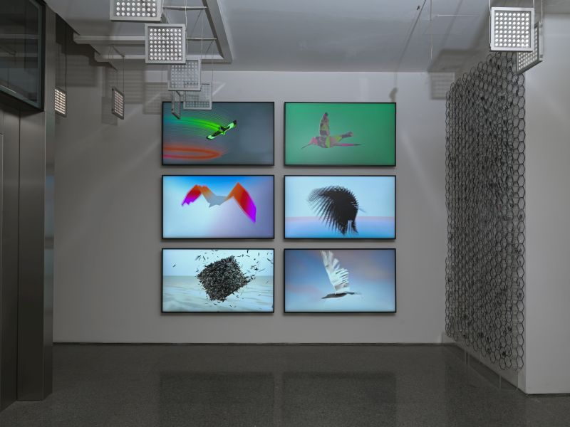 Hareket ile hareketsizlik, aşırı hız ile yavaşlık, bağlantı ile yalnızlık arasında yer alan çalışmalar, günümüzün kentsel, fiziksel, dijital ve duygusal ortamlarında insanın yönünü sorguluyor. Aitken’in pandemi döneminde ürettiği üç kanallı film enstalasyonu Bayraklar ve Enkaz (2021) ile tekstil işi Dijital Detoks (2020), yakın tarihte ilk kez küresel çapta bir duraksamaya yol açan karantina dönemini; o ana kadar durmadan akmakta olan bilgi ve insan selinin ortasındaki sessizlik ve soluklanma anını yansıtıyor. Pandemi öncesinde üretilmesine rağmen benzer bağlantı sorunsallarına değinen 3 Modern Figür (nefes almayı unutma) (2018), cep telefonuna sığabilecek bir boşluğu sıkıca kavrayan, yalnız ve sabit üç parlayan figürü sergiliyor. Temasına uygun şekilde, müzenin iki katı arasındaki geçiş yoluna yerleştirilen fotoğraf serisi pencereler (2007), tren ya da uçak pencerelerinden bir dizi anonim karakteri göstererek yolculuğun ara mekânlarına odaklanıyor. Sanatçının mobilite ve doğrusal olmayan anlatılar üzerine yaptığı araştırmaları takiben ürettiği uyurgezerler (2007) ise, New York’ta dolaşan ve hikâyeleri parçalı bir anlatı hâlinde kurgulanan beş karakterin yaşamını tasvir ediyor. Eş merkezli, kesişen ve genişleyen iki daireden oluşan neon eser iki kere düşünme II (2006) ise benzer bir şekilde daima hareket ediyor ve bu hareketi bir sekans boyunca sürdürüyor.